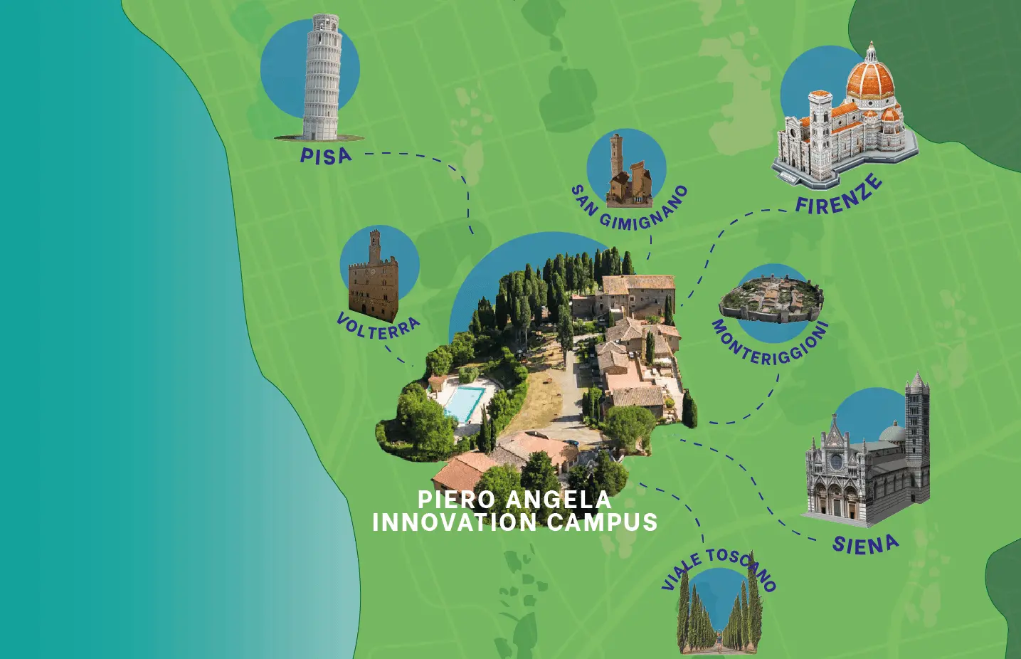 L’Immodrone Academy si trova all’interno del Piero Angela Innovation Campus, tra Firenze, Pisa e Siena (vicino ai comuni di Volterra e San Gimignano), un luogo esclusivo dove giovani, brillanti innovatori, startupper, artisti e creativi, possono trovare un ambiente e personale che li aiuterà a diventare dei veri professionisti, trasformando la loro passione in un lavoro.